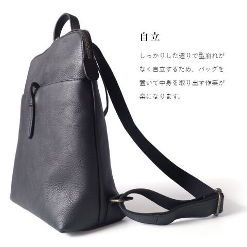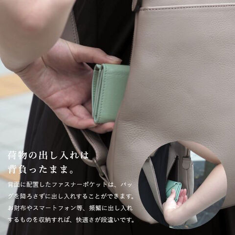 didoのリュックには、前面にフロントポケットと背面にファスナーポケットが備わっており、すぐに取り出したい貴重品や必需品を整理しやすく、非常に便利です。小ぶりに見えますが、実際には13.6インチのノートPC、A4サイズのノート、スマートフォン、折り畳み傘、500mlのペットボトルなど、さまざまなアイテムをしっかり収納できます。しっかりした造りで型崩れがなく自立するため、バッグを置いて中身を取り出す作業が楽になります。カジュアルもフォーマルもビジネスもあらゆるシーンをこなせ、コーデの質を高める上質さも備えた大人のリュックです。