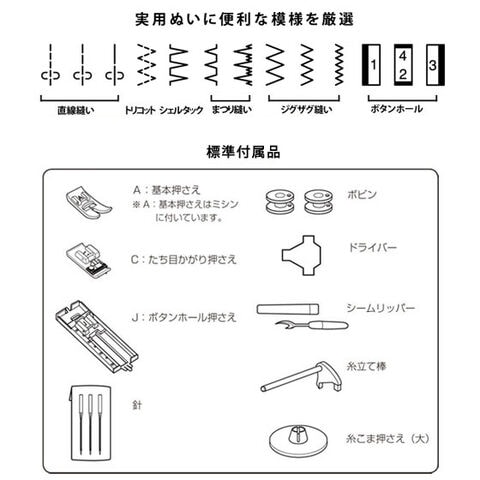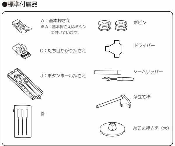 付属品 針(3本)、ボビン(3個、1個は本体に取付済)、説明書、フットコントローラー、シームリッパー、糸立棒、糸コマ押さえ、たち目かがり押さえ、ボタンホール押さえ、ドライバー、ダストカバー、フットコントローラー、取扱説明書