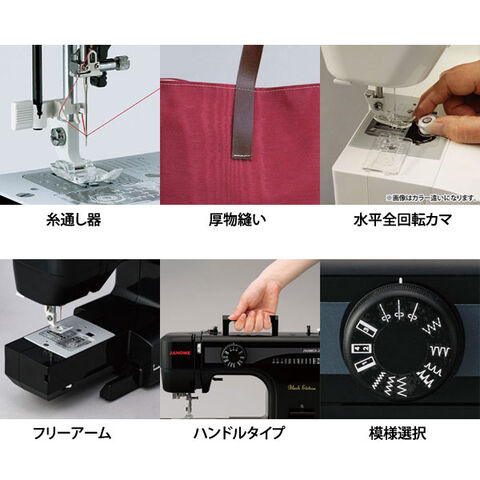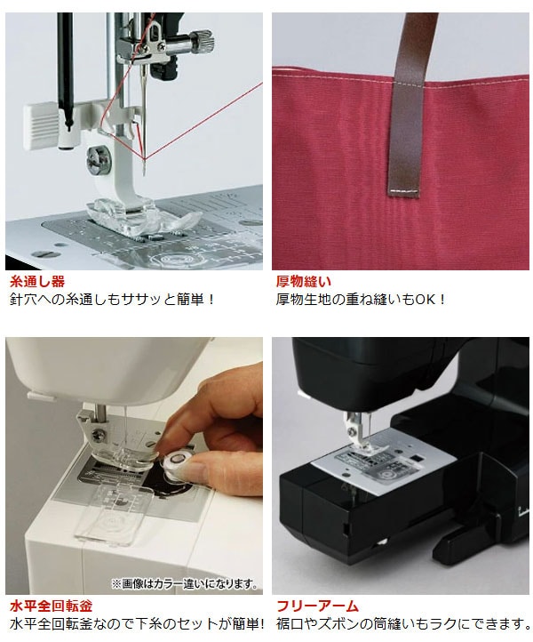 実用性を重視したシンプルな家庭用コンパクトミシン。両手が自由に使えるフットコントローラータイプなので細かい部分はもちろん、カーテン、エプロン、ズボン等の大きな布地も縫いやすい!厚物生地の重ね縫いもOK、簡単糸通し、水平全回転釡、フリーアーム等、ご家庭でのソーイングにあると便利な機能を搭載!返し縫いボタンは大きめのレバーで、年配の方やお子様にも分かりやすく使いやすい仕様になっています。軽軽くて持ちやすいハンドルタイプで持ち運びも楽々!ミシンをホコリから守るダストカバー付きです。