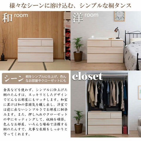 伝統的な桐箪笥を、現代の住まいにあうように簡易に、そして洋風なデザインにアレンジした、桐洋風チェスト。着物だけではなく、帯や太鼓など、和装小物の収納ができる桐箪笥。これだけの着物関連アイテムが収納できる。またシリーズがあるので、他のアイテムと重ねて使うと、充実した和の収納ができます。桐をシンプルに仕上げ、色んなお部屋やクローゼットにも金具などを使わず、シンプルに仕上げた桐のたんすは、スッキリとしたデザインでどんなお部屋にもマッチします。和室に置けば和の雰囲気を醸し出し、洋室では前に出ないシンプルさでお部屋に馴染みます。また、押し入れやクローゼットの中にセッティングして、収納を確保。色んなお部屋、いろんな場面で活躍する桐のたんすで、大事な衣類をしっかりと守ってくれます。