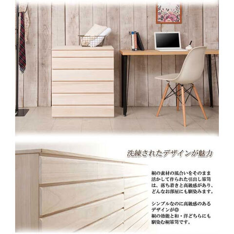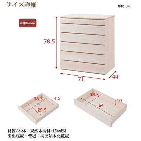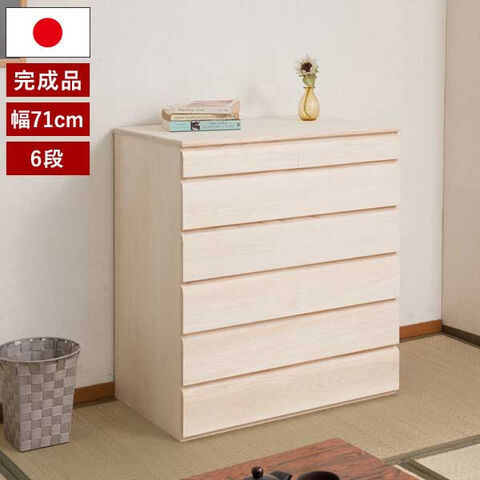 桐洋風チェスト 6段 生地仕上げタイプ 幅71cm 完成品 日本製 総桐箪笥 桐引出し 桐袖出し HI-0101-NS