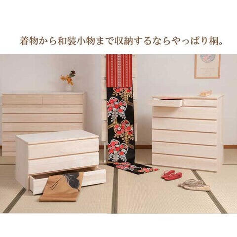 衣類収納に最適な桐タンスにデザイン性をプラス。和室・洋室のどちらにも合う、風格と気品を兼ね備えた逸品。通常の桐箪笥とは違い、天板に重い物を載せられるように、15mm厚の2枚重ねを採用。強度にもこだわった贅沢な造りです。サイズも収納量に合わせて6タイプからお選び頂けます。