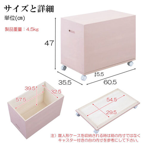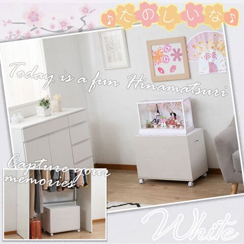 ガラスケース入りの親王飾りを収納するのに最適な総桐製コンパクト雛人形ケースが新登場。出し入れしやすいカバー式で、飾り台にもなる機能派ケース。飾り場所に置く台がない、急遽台を用意しないといけないなどの声をカタチにした、桐ケースに乗せればちょうど良い高さに飾れる一石二鳥の収納ケース。流行りのくすみピンクカラーの親王飾りの美観を損なわないピンクカラーもご用意。万能なホワイトカラーと2色から選べます。また、少し大きめのスノコ収納付きの高さ60.5cmタイプは親王飾りと、装飾品まで収納できる万能型。スノコは取り外し可能で使い方に合わせて利用できます。桐材は内部を一定の湿度に保とうとする働きがあるので、ひな人形や大事な着物などを湿気から守る桐箱にしまうのがベスト。押し入れやクローゼットに入るサイズ感で、長期保管に最適です。キャスター付きなので移動や出し入れが楽々。桃の節句のお雛さまや端午の節句の兜を収納するのにとても便利で重宝すること間違いなしです。