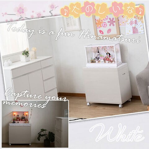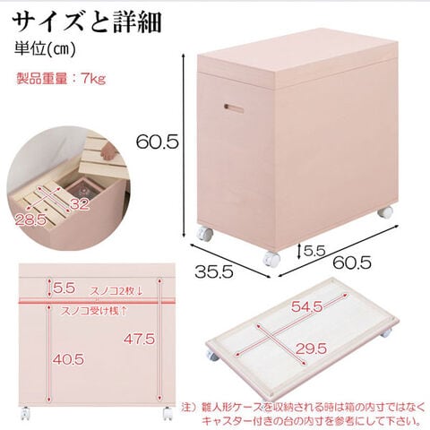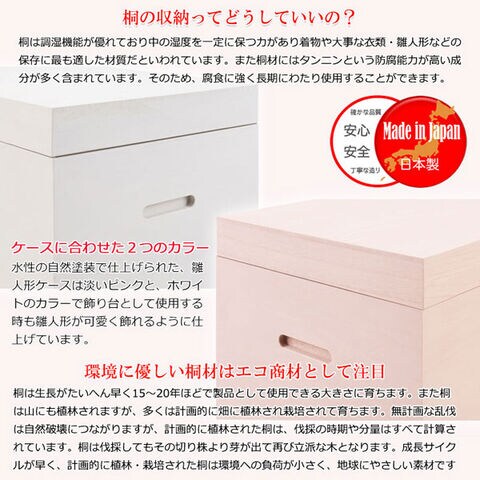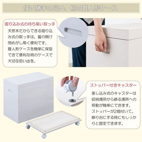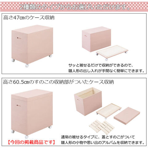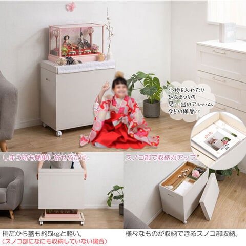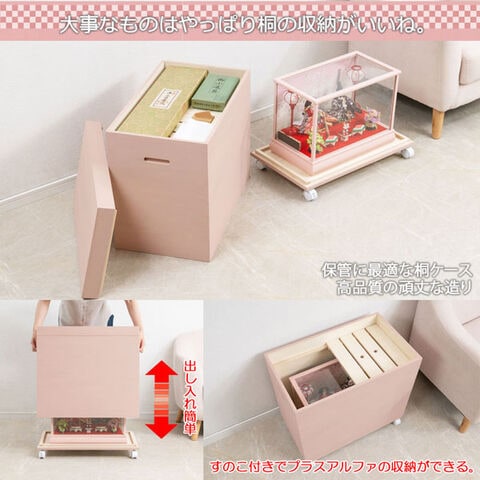 ガラスケース入りの親王飾りを収納するのに最適な総桐製コンパクト雛人形ケースが新登場。出し入れしやすいカバー式で、飾り台にもなる機能派ケース。飾り場所に置く台がない、急遽台を用意しないといけないなどの声をカタチにした、桐ケースに乗せればちょうど良い高さに飾れる一石二鳥の収納ケース。流行りのくすみピンクカラーの親王飾りの美観を損なわないピンクカラーもご用意。万能なホワイトカラーと2色から選べます。また、少し大きめのスノコ収納付きの高さ60.5cmタイプは親王飾りと、装飾品まで収納できる万能型。スノコは取り外し可能で使い方に合わせて利用できます。桐材は内部を一定の湿度に保とうとする働きがあるので、ひな人形や大事な着物などを湿気から守る桐箱にしまうのがベスト。押し入れやクローゼットに入るサイズ感で、長期保管に最適です。キャスター付きなので移動や出し入れが楽々。桃の節句のお雛さまや端午の節句の兜を収納するのにとても便利で重宝すること間違いなしです。