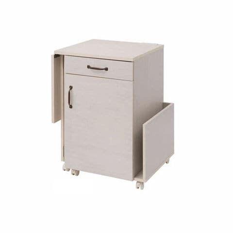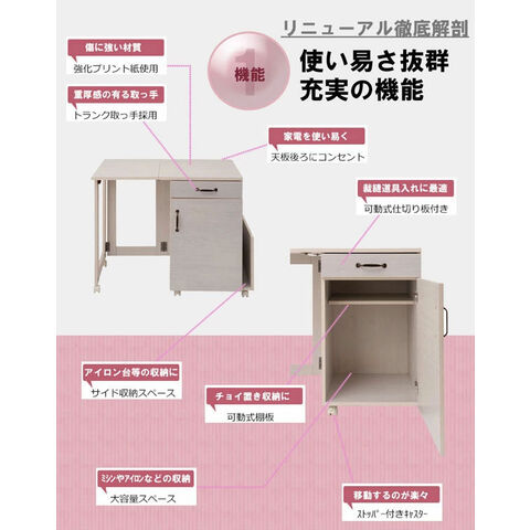 折り畳み式で使いやすいハウスキーピングワゴン。ミシン台として、アイロン台として、ダイニングサイドにカウンターとして、デスクとしても様々なシーンで使える便利なワゴン。使わない時は天板をたたんで、使う時だけ出せる省スペース設計。コンセントも付属し、ミシンやアイロンを使うのに最適な天板奥に配備。引出し内に組み替えや取り外しができる万能仕切り板が付属。扉内に取り外し可能な棚板もついて何かと収納に便利。サイドラックにはアイロン台や生地をストックするなどあらゆるうれしい機能がふんだんに搭載。使ってわかる機能美をぜひ実感してください。