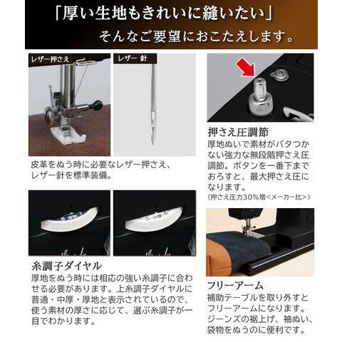 | 付属品 | 基本押さえ(最初にミシンの押さえホルダーに付いている押さえ)、サテン押さえ、レザー押さえ、ボタンホール押さえ、ボビン4個、フェルト2枚、シームリッパー、ドライバー大小、針(HA×1)、レザー針(HA×1LL)、糸通し器、油さし、取扱説明書、説明DVD、フットコントローラー、ミシンカバー(ハードケース) |