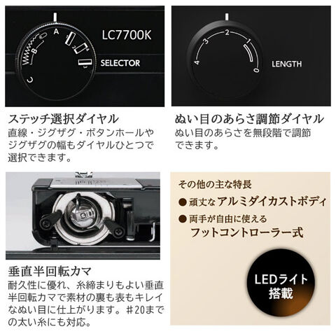 | 仕様・機能 | 糸調子ダイヤル、押さえ圧調節、フリーアーム、LEDランプ、縫い目長さ調節、縫い目の幅調節、模様数/3種類、1種類4ステップボタンホール、無段階速度調節、フットコントローラー式 |