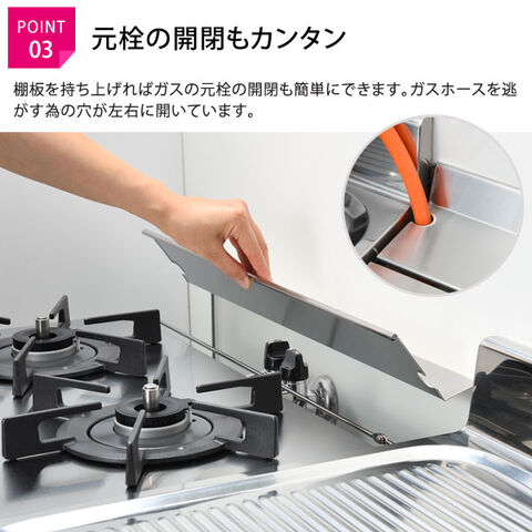 コンロのすき間をしっかりカバーし、調理中の汚れや落下物を防止してくれるコンロすきまラック。棚にはスパイスなどを置くことができ、調理中も手に取りやすく作業効率もアップ。棚板を持ち上げれば、ガスの元栓の開閉も簡単。ガスホースを逃すための穴が左右に開いており、スッキリ設置できます。棚板はステンレス製で、汚れがついてもサッとふき取りやすく、お手入れも簡単。ガラストップ型コンロにも合うシンプルなデザインで簡単に組立可能です。