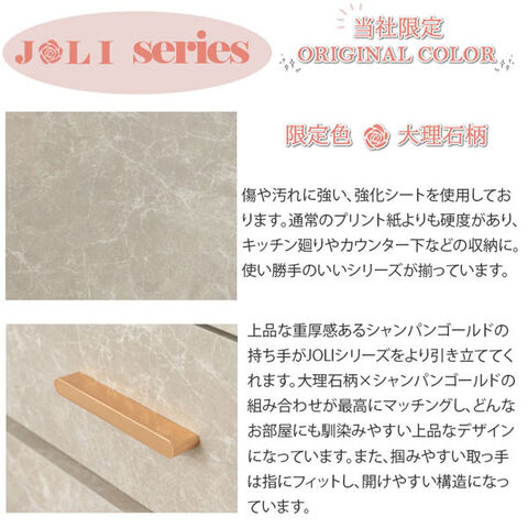 限定オリジナルカラー大理石柄とシャンパンゴールドの取っ手が高級感溢れるデザイン。甘すぎないくすみカラーグレー×直線的シンプルデザインが、お部屋に馴染みやすく、インテリアをお洒落に演出します。コンパクトながらも収納力抜群でカウンター下や窓下に丁度良い高さで、一人暮らしやワンルームにも使いやすいサイズ感です。オリジナルカラーの大理石柄は主張しすぎないくすみカラー、それでいて目立つ存在感は一つ置くだけで、雰囲気UP。モノトーンインテリアが好みだけど、単調でモノ足りない、そんな方にもバッチリハマるのでは?ひとつ置けば追加したくなる、そんなJOLIシリーズを是非。