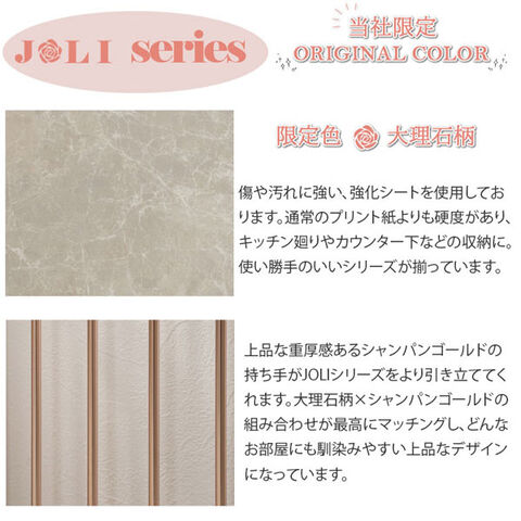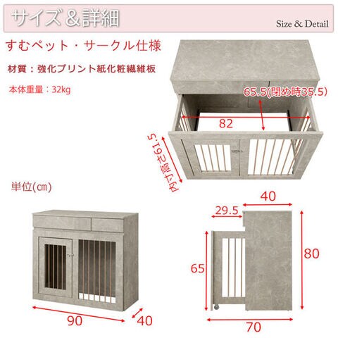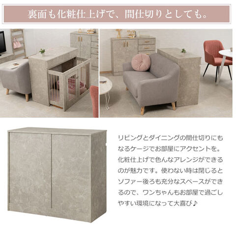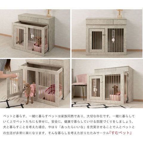 インテリア性も兼ねたペット家具『すむぺっとシリーズ』から限定オリジナルカラー大理石柄とシャンパンゴールドの取っ手が高級感溢れるJOLIシリーズに新登場!甘すぎないくすみカラーグレー×直線的シンプルデザインが、お部屋に馴染みやすく、インテリアをお洒落に演出します。コンパクトながらも機能的でリビングボード感覚の丁度良い高さは一人暮らしやワンルームにも使いやすいサイズ感です。収納も付いたドッグサークルは、愛犬をサークルに入れるときだけ広げるので、普段は収納キャビネットのように使えるのが魅力!ケージ部がスライド式になっているので、すごく簡単に設置でき、開閉も超簡単!閉じている時は本体の奥行は約40cmで邪魔にならず、他の家具と並べてもスッキリとします。飼い主も愛犬も過ごしやすい空間で毎日が楽しくなりそう!長く暮らすからこそ使い易くお洒落なサークルが◎。オリジナルカラーの大理石柄は主張しすぎないくすみカラー、それでいて目立つ存在感は一つ置くだけで、雰囲気UP。モノトーンインテリアが好みだけど、単調でモノ足りない、そんな方にもバッチリハマるのでは?ひとつ置けば追加したくなる、そんなJOLIシリーズを是非。