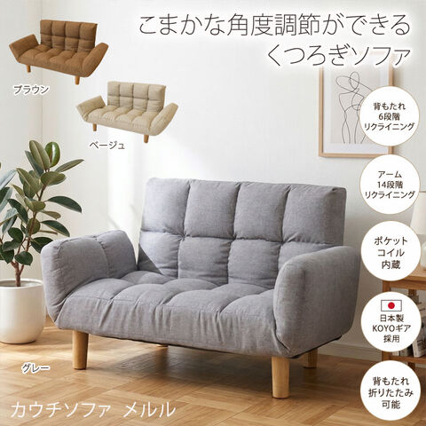 カウチソファ メルル ソファ 2人掛け コンパクト リクライニング ポケットコイル 14段階ギア 6段階ギア 肘掛け 背もたれ 折りたたみ 布製 ファブリック MERURU-LI