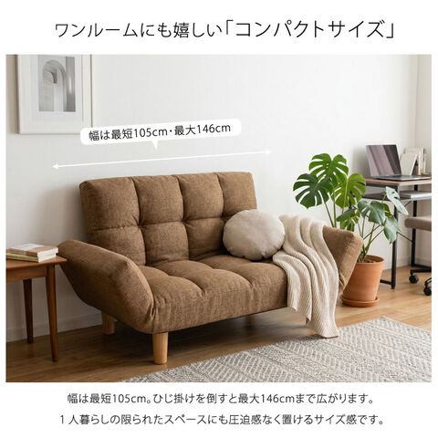 細かく調整できるリクライニングで、理想のくつろぎを実現するカウチソファ メルル。背6段×肘14段のリクライニングにより、「座る・寝る・脚を伸ばす」が自由自在です。座面にはポケットコイルとウレタンチップを採用し、長時間でも快適な座り心地をキープ。ワンルームでも使いやすいコンパクト設計で、折りたたみ収納も可能。さらに脚を外せばフロアソファとしても活躍し、空間に合わせた使い方が広がります。