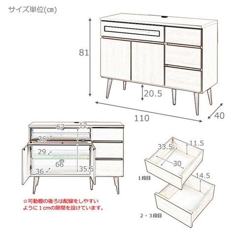 | 仕様 | 棚板/可動式1枚、扉内コード穴付き、引出しストッパー付き、耐荷重量/天板(約)20kg・棚板(約)5kg |