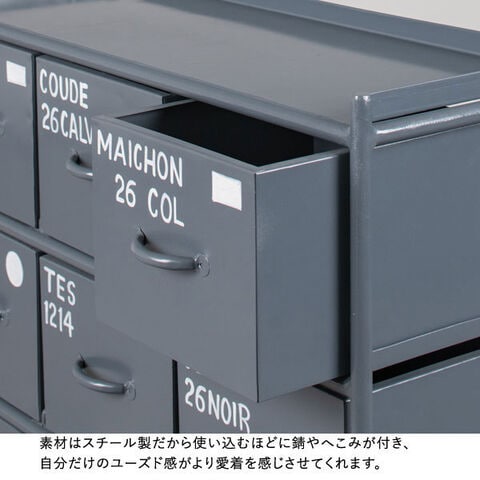 ・アイアンは湿気に弱い素材です。雨があたる場所・湿気の多い場所でのご使用や、湿ったものが触れたままでのご使用は錆が発生しやすくなります。 ・摩耗により他のものへ色移りがする恐れがありますので、衣類や繊維製品の収納にはご注意ください。 ・金属等の硬いものの接触により傷が付き、塗装がはがれる場合がございます。 ・使い込んだようなユーズド風の質感を持たせた商品です。お届け段階から小さな傷や凹みなどの風合いがあります。 ・設置後すぐは素材・塗料の臭いがする場合があります。お部屋の換気でご対応ください。 ・引出しのロゴ文字は商品によって異なる場合がございます。 ・質感や経年変化をお楽しみいただけるチェストです。ご使用につれてできる傷や凹み、錆びなどを風合いとしてお楽しみください。 |
