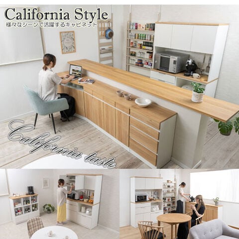 ナチュラルとホワイトのバイカラーで仕上げた【OCEAN】キッチンボードは、この1台で食器類や家電製品、キッチン小物、食品ストックもまとめて大量収納できる優れもの。オープン部天井には調湿・消臭・防カビ効果のあるモイスを使用。背面の有孔ボードは熱を逃しながら、S字フックなどを使って色々な物掛けることもできます。スライド棚やカウンターにはコンセント付きで家電製品の設置に◎。フルオープンスライドレールの引き出しは奥まで見やすく、取り出しやすさも魅力。実用性とデザイン性を兼ね備えたキッチンボードは安心高品質の日本製。完成品でのお届けなのですぐにお使いいただけます。サイズは幅89.5cmと幅120cmの2サイズ展開。シンプルながらも多彩な機能でストレスのないキッチン空間が完成します。