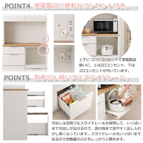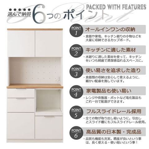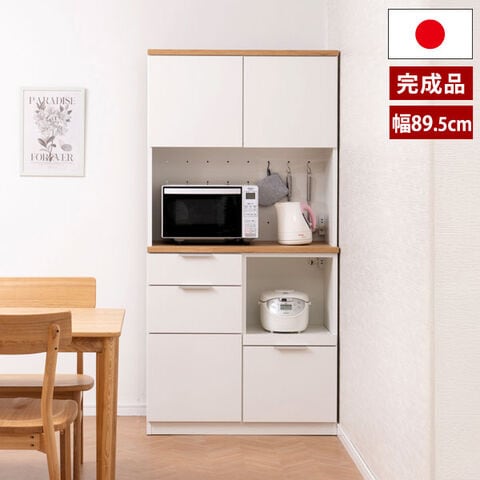 ナチュラルとホワイトのバイカラーで仕上げた【OCEAN】キッチンボードは、この1台で食器類や家電製品、キッチン小物、食品ストックもまとめて大量収納できる優れもの。オープン部天井には調湿・消臭・防カビ効果のあるモイスを使用。背面の有孔ボードは熱を逃しながら、S字フックなどを使って色々な物掛けることもできます。スライド棚やカウンターにはコンセント付きで家電製品の設置に◎。フルオープンスライドレールの引き出しは奥まで見やすく、取り出しやすさも魅力。実用性とデザイン性を兼ね備えたキッチンボードは安心高品質の日本製。完成品でのお届けなのですぐにお使いいただけます。サイズは幅89.5cmと幅120cmの2サイズ展開。シンプルながらも多彩な機能でストレスのないキッチン空間が完成します。
