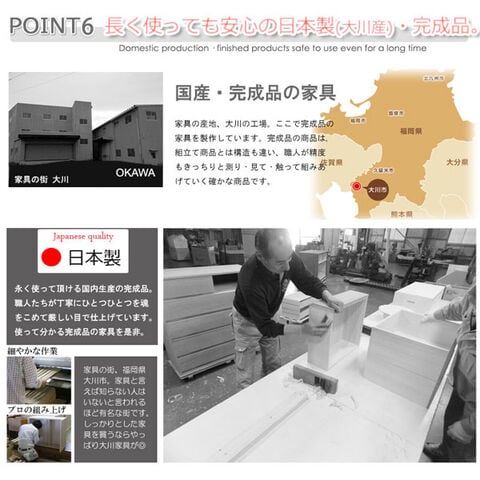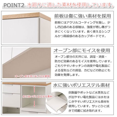 | 材質 | 前板/化粧繊維板(アクリルコーティング)、スライド棚/ポリエステル化粧繊維板、スライド棚上部/モイス付き、引出し引手/アルミニウム、その他/強化プリント紙化粧繊維板 |