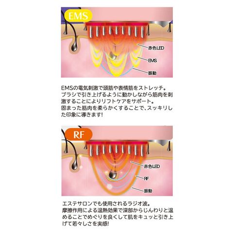 日々の日常生活で固くなりがちな頭皮、頭筋を25本のブラシ型電極からのEMS&RFで刺激。同時に赤色LEDが発光し、さらに振動を与えることで効率的なケア。滞りがちな流れをスッキリ!お顔、頭以外にも首、デコルテ、二の腕、脚にもつかえて全身ケアも可能。防水仕様(IPX5)なのでお風呂でも使えます。毎日のバスタイムで効率よくお手入れ可能です。頭やお肌をしっかり濡らして温まった状態が効果的。シャンプーしながらも併用可能です。