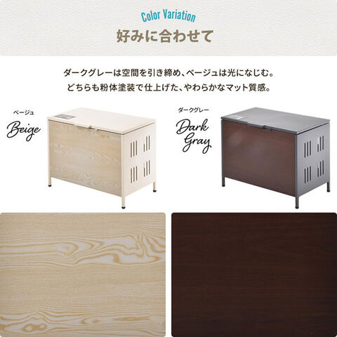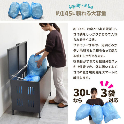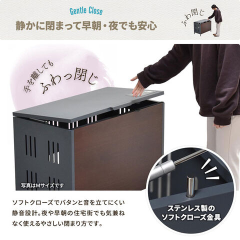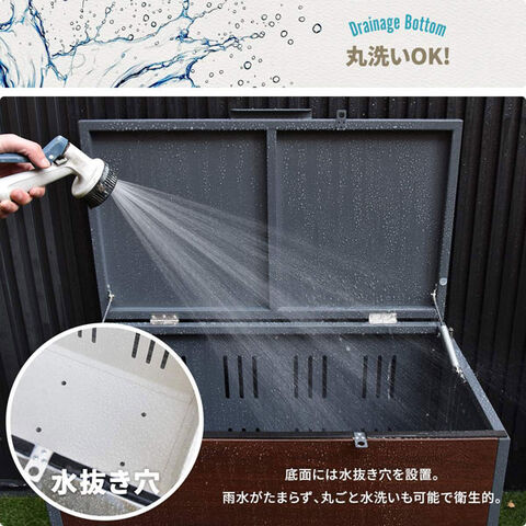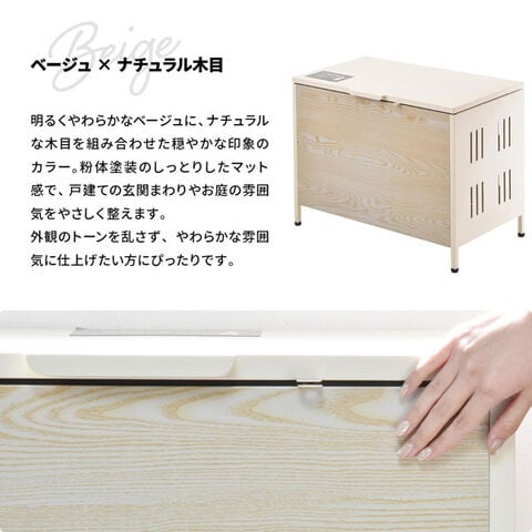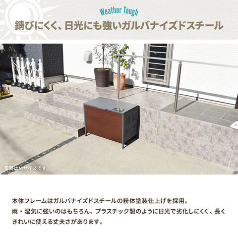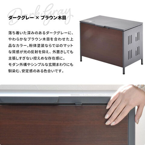 屋外ゴミ収納庫「Lucre」は、屋外でのゴミ収納やガーデニング用品の保管に適した多目的収納ボックスです。ガス圧ダンパーを搭載し、フタは軽い力で開閉でき、閉まる際もソフトクローズ機能により静かで安全。耐久性に優れた亜鉛めっきスチール素材に、落ち着いた木目調デザインを施し、玄関先やお庭にも上品に調和します。底面には水抜き穴を設け、雨水がたまりにくく、丸ごと水洗いも可能。さらに市販の鍵を取り付ければ宅配ボックスとしても使用でき、機能性と美しさを兼ね備えた収納庫です。設置スペースやご家族の人数に合わせて、SとMの2サイズからお選びいただけます。カラーはダークグレー・ベージュの2色展開です。