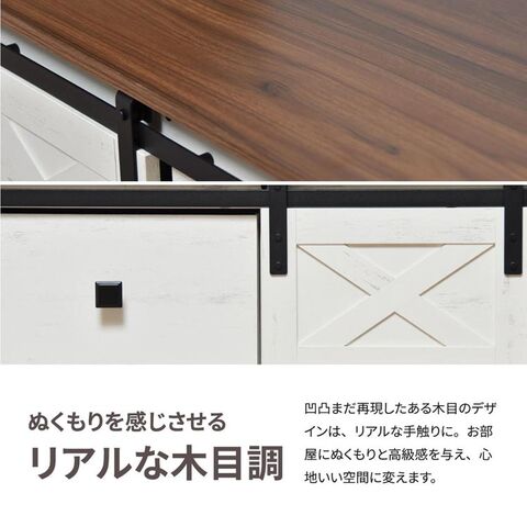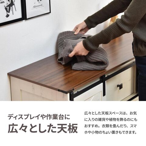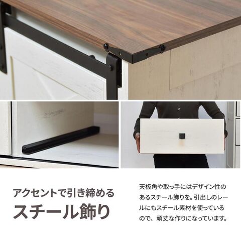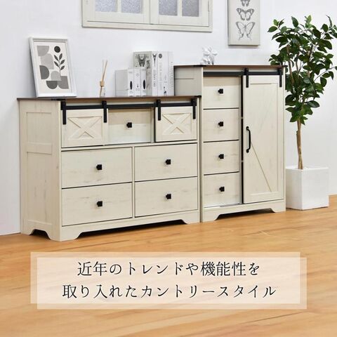 ゆったりくつろげる素朴なファームハウススタイル風な収納チェスト。素朴でリラックスした雰囲気の家具は「シェーカースタイル」とも呼ばれており、見た目も心地よい空間づくりをしていただけます。塗装された風のメラミン前板とブラウンの天板がアクセントになっており、ヴィンテージ風の仕上がりにもなっています。収納力もあり、不織布の引き出しが4杯、スライド引き出しの中は棚付きの収納で、しっかり収納できます。リアルな木目調の広々とした天板スペースはお気に入りの雑貨や植物を飾るのにもおすすめです。