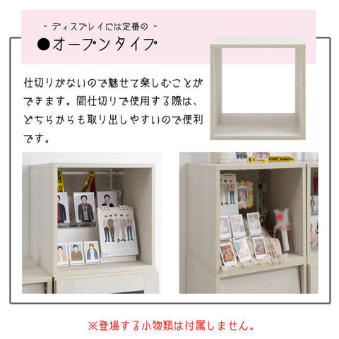 組み替え自由自在!推し活キューブラック「推しピの推し入れ」。真っ白なホワイトとは違い、木とホワイトが融合したような可愛らしさ満開のホワイトカラー。オープン、扉、引出し、フラップ扉と4つのタイプがあり、グッズの量やライフスタイルに合わせて組み替えることができるのでグッズが増えても安心!必要な分だけ買い足せるのもポイントです。キューブ型なので女性でも運びやすく、階段状にしたり、ローボード風、間仕切りなど様々な姿で推し活収納を楽しめます。