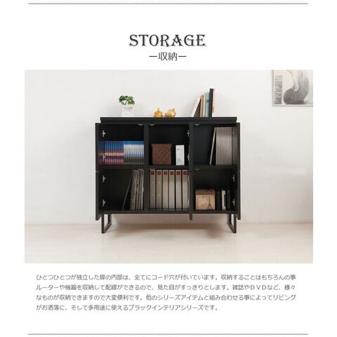 真っ黒なスチール製の脚部と天板下の隙間もブラックにしてデザインにこだわったブラックインテリアシリーズ。ブラックの木目が無機質なお部屋に温かみを与えてくれます。傷がつきにくい強化プリント紙を使用。扉タイプはプッシュ式で開閉が簡単。それぞれコード穴があり、収納+ルーターなど配線などがしやすい仕様になっています。安心・安全の日本製。デザインだけでなく品質・機能にもこだわったシリーズはスペースや用途に合わせて全8タイプからお選び頂けます。シリーズで揃えればスタイリッシュでお洒落なリビング空間が完成します。