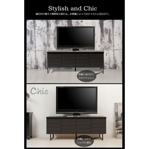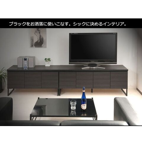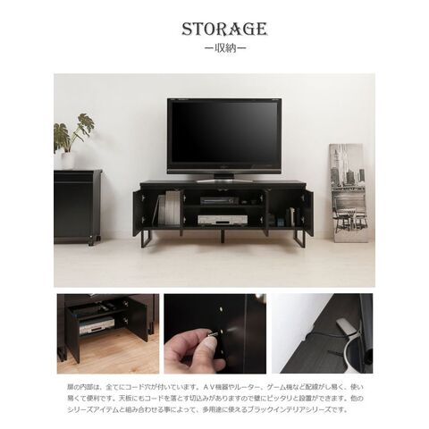 真っ黒なスチール製の脚部と天板下の隙間もブラックにしてデザインにこだわったブラックインテリアシリーズ。ブラックの木目が無機質なお部屋に温かみを与えてくれます。傷がつきにくい強化プリント紙を使用。テレビボードタイプは扉の内部全てにコード穴が付いており、AV機器やルーター、ゲーム機など配線がしやすく天板にはコードが落とせる切り込みもあり壁にピッタリと設置できます。扉はワンプッシュで開閉ができ、使い易さ抜群です。安心・安全の日本製。デザインだけでなく品質・機能にもこだわったシリーズはスペースや用途に合わせて全8タイプからお選び頂けます。シリーズで揃えればスタイリッシュでお洒落なリビング空間が完成します。