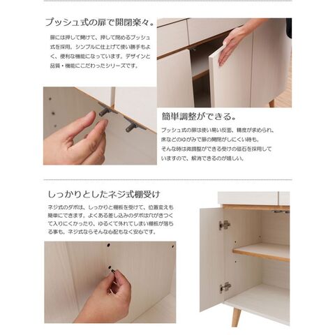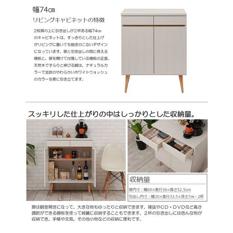キャビネット リビングキャビネット プッシュ式扉 リビング収納 幅74cm 北欧 シンプル 天然木脚 日本製 完成品 Solid ソリッド ホワイトウォッシュ NK04-014WH-NS