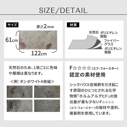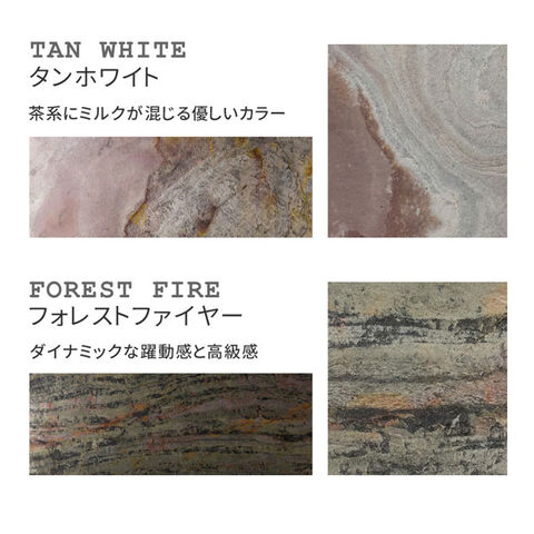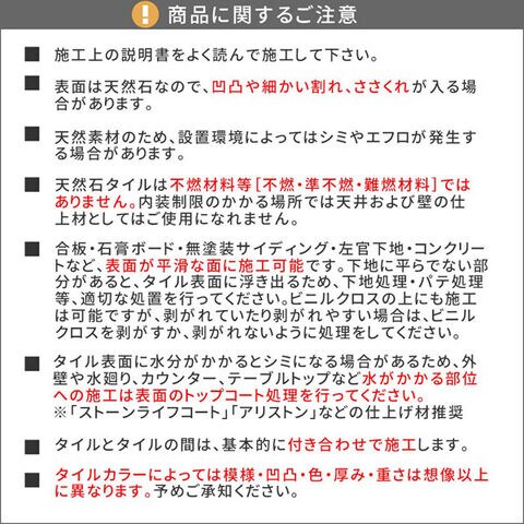 | ご注意 | ・表面は天然石なので、凹凸や細かい割れ、ささくれが入る場合があります。 ・タイル表面に水分がかかるとシミになる場合があるため、外壁や水廻り、カウンター、テーブルトップなど水がかかる部位への施工は表面のトップコート処理を行ってください。 |