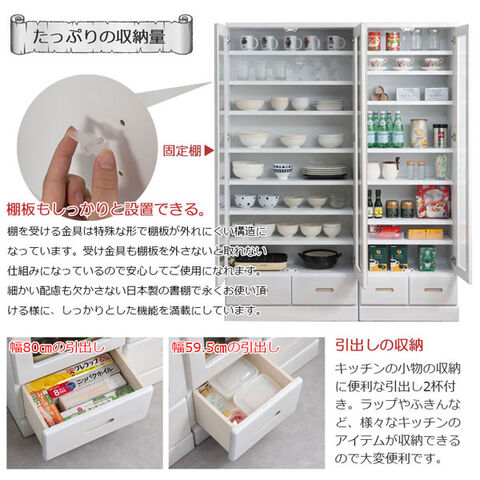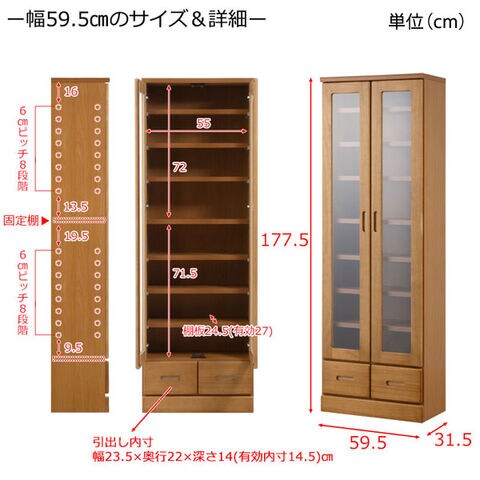 | サイズ(約) | 本体/幅59.5×奥行31.5×高さ177.5cm 扉内寸/幅55×奥行27(可動棚24.5)×高さ(上段72・下段71.5)cm 引出し内寸/幅23.5×奥行22×深さ14(有効14.5)cm |