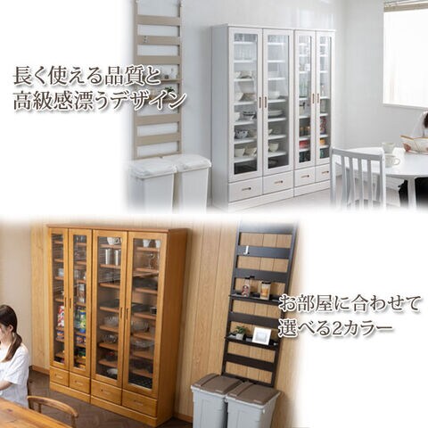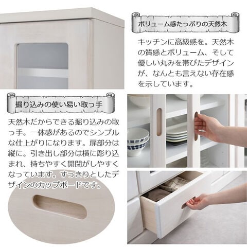 天然木を使用した薄型の食器棚『TAITYAKI タイヤキ』シリーズ。桐は調湿機能が高く、食器類などの収納にも適していて洋風にデザインされた、高級感のある日本製の食器棚。前板は木目を生かしたホワイトウォッシュ仕様、本体は木目の無い単色ホワイトでコントラストが絶妙。前板に天然木を使用した使いやすい開き扉に、引出しも付いて便利。天然木の木の香りと丸みを帯びたデザインが、天然木ならではの高級感のある仕上げになっています。奥行31.5cmの省スペース設計の薄型を活かし、キッチンに置いても圧迫感がなく狭小住宅でもしっかり収納を確保。固定式&可動式仕様の棚板は全部で7枚付いて、食器類の収納がたっぷりとできます。サイズは幅59.5cmと80cm、カラーはホワイトウォッシュとライトブラウンの2色からお選び頂けます。