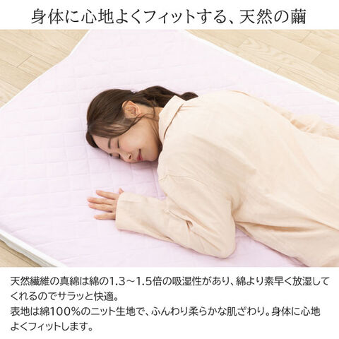 天然繊維の真綿(シルク100%)を使用した、洗える敷パッド。吸湿性・放湿性と軽さに優れており、いつでもサラッと快適な使用感。真綿の繊維は切れにくく保湿性もあるため、静電気が少なくホコリも出にくいのもうれしいポイントです。表地は綿100%のニット生地でふんわり柔らかな肌ざわり。身体に心地よくフィットします。「冬は暖かく、夏は涼しい」ため、オールシーズンご使用いただけます。また、ご家庭の洗濯機で丸洗い可能なので、清潔で快適な眠りをキープすることができます。カラーはピンク系・ベージュ系の2色展開です。