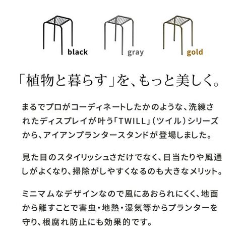 まるでプロがコーディネートしたかのような洗練されたディスプレイが叶う「TWILL」(ツイル)シリーズから、アイアンプランタースタンドが登場しました。見た目のスタイリッシュさだけでなく、日当たりや風通しがよくなり、掃除がしやすくなるのも大きなメリット。ミニマムなデザインなので風にあおられにくく、地面から離すことで害虫・地熱・湿気等からプランターを守り、根腐れ防止にも効果的です。