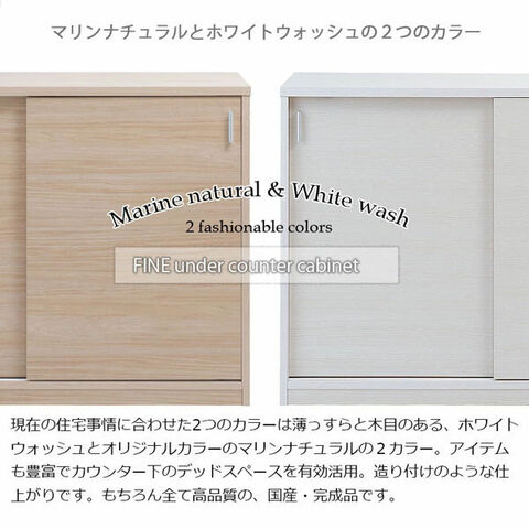 カラーリング&デザインがシンプルでおしゃれなカウンター下収納【FINE】ファインシリーズが新登場。現在の住宅事情に合わせた2つのカラーは薄っすらと木目のあるホワイトウォッシュとオリジナルカラーのマリンナチュラルの2カラー。アイテムも豊富でカウンター下のデッドスペースを有効活用でき、造り付けのような仕上がりです。今までの引戸式の薄型収納といえば奥行内寸が18.5-23.5cm程度が多かったのですが、今回少しサイズを拡げたことでA4ファイル等も入るようになり、圧迫感なく、且つ多彩な収納が可能です。カウンター下の収納はキッチンアイテムだけではなく、リビングで使用する物や子供の学習用品など現在の生活様式・住宅事情・生活習慣に合わせてお使いいただけます。開き扉の商品では、開閉のためにスペースが扉の幅分必要になってきますが、引き戸式ならわずかなスペースでOK。取り出し易い引き戸式でキッチンスペースが使い易くなります。可動棚板の後部に1cmのすき間があり、上下の配線がしやすくなっています。配線に便利なコード穴付きで、ルーターなども収納できます。滑車付きの扉はスムーズな開閉でストレスなくご使用になれます。日本製&組立不要のすぐに使える完成品でお届けします。