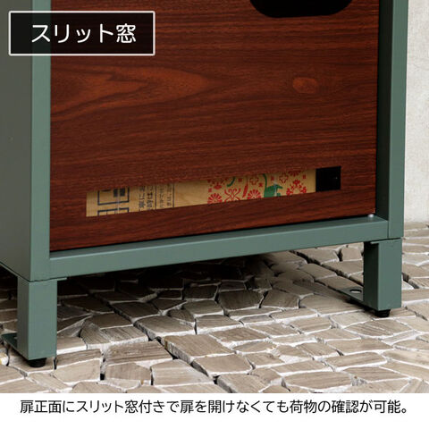 取出口が非常に広く、大きな荷物や同時に複数の荷物の配達が可能な大容量宅配ボックス。扉正面にスリット窓付きで、扉を開けなくても荷物の確認が可能です。ダイヤルロックとシリンダー錠でドアの開閉が可能で防犯面も安心です。解錠用キー、キーフック付き印鑑ケース、宅配業者用の配達マニュアルが付属しており、設置してすぐにご使用いただけます。「本体」と「脚パーツ」のみをボルトで固定する簡易組立品ですので設置も簡単!付属のアンカーボルトで地面に固定することも可能です。濃いグレーのダークーグレーとブラウン木目の組み合わせと、落ち着いた緑のフォレストグリーンとブラウン木目の組み合わせの2色展開です。