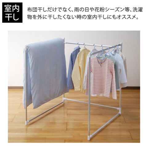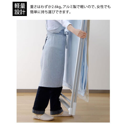 ふとん干しが手軽にできるアルミ製折りたたみ布団干し。軽量なアルミ素材を使用しており、わずか約2.6kgと女性でも楽に持ち運び可能。スペースに合わせて、形や角度を自由に調整できるから、限られたスペースでも効率よく使えます。ふとんだけでなく、布団カバーやシーツなど大きな洗濯物もしっかり干せる広々スペース。使わない時は折りたたんで約7cmの薄さに。クローゼットのすき間や家具の横にサッと収納できて、場所を取りません。