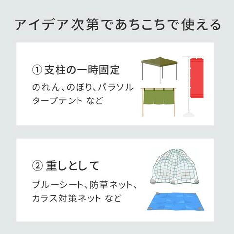 オーニング、タープテント、ソーラーライト、フェンス、パラソル、のぼり旗等を固定できる、多機能ブロックウエイト。土の上だけでなく、ウッドデッキやコンクリートの上など、場所を選ばずに設置できます。オブジェとしても楽しめるかわいらしいレンガ調が、お庭やベランダになじんで、おしゃれな雰囲気を演出します。ワンタッチでオーニングを固定。紐を金具に結ぶだけの簡単設置!コンクリートブロックや土嚢にはない柔らかな雰囲気で、お庭にとけこみます。土のない場所やベランダ、玄関先でも、スティックタイプのソーラーライトを立てて使うことができます。フェンスやアーチなども工事不要でカンタン設置。手軽に見ごたえのあるお庭が作れます。穴が複数あることで、横一列に繋げたり、お庭の角にあわせてL字型にしたりと、自由なレイアウトが楽しめます。