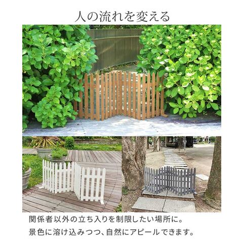 ジグザグ、コの字型、四角形など・・・。好きな形で自在に置ける♪置くだけで空間を仕切れる木製フェンスです。自由な形に変えることができ、自立するので使い勝手抜群です。曲がるから色々な場所で活躍。通路、花壇、玄関アプローチ、駐車場、お隣との境目など、空間をお洒落に仕切れます。関係者以外の立ち入りを制限したい場所に。景色に溶け込みつつ、自然にアピールできます。花壇を見映えよく、使いやすく。プランターカバーとして、繊細な植物の保護に。通路へのはみ出し防止など・・・いろんな用途・シーンで活躍します。ミニフェンスからバージョンアップ。スタンドがついて、板が分厚くなりました。カラーはホワイト・ライトブラウン・グレーの3色からお選びいただけます。