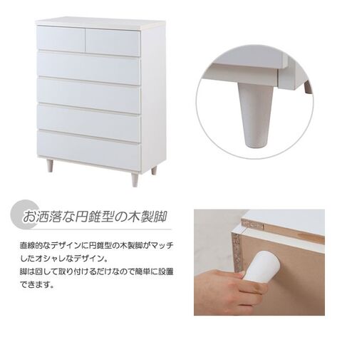 直線的なデザインに円錐型の木製脚がマッチしたホワイトチェスト。収納力とデザイン性のバランスを考えた有能チェストです。モダンシーンから可愛い系まで男女問わず様々な場面で活躍します。引出しの間には全段地板入りで強度も◎。大引出しはスライドレール付きでスムーズに開閉します。スタイリッシュに仕上がったチェストは脚の丸みがこだわりです。脚のみ取付けの完成品で届いてすぐにお使いいただけます。サイズは3段ロータイプと5段ハイタイプからお選びいただけます。