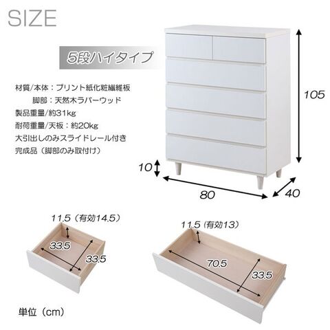 チェスト タンス 完成品 箪笥 幅80cm 5段 6杯 日本製 脚付 ホワイト ハイタイプ スライドレール付 おしゃれ シンプル SA-0022