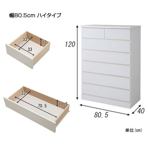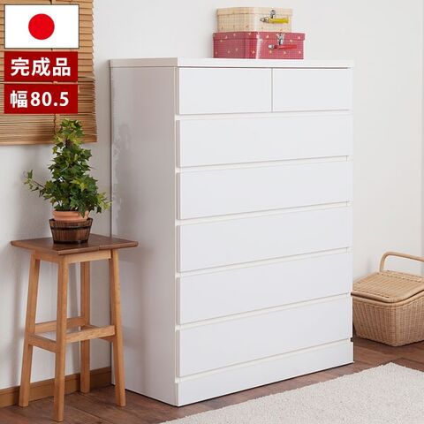 洋室や和室から子供部屋まで、どんなシーンにも溶け込む;ホワイトのチェスト。収納力抜群のチェストは幅80.5cmのハイタイプと幅119.5cmのロータイプの2種類をご用意。大引出しはレール付きで出し入れが楽々。重たいものを入れても開閉が楽に出来、使い易さ抜群です。 箪笥の反りや歪みをおさえて、いつまでも長くお使い頂けるように全段に地板を入れて頑丈な造りになっています。届いてすぐにお使いいただける安心安全の国産・完成品のホワイトチェストです。