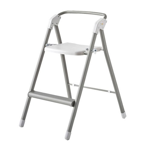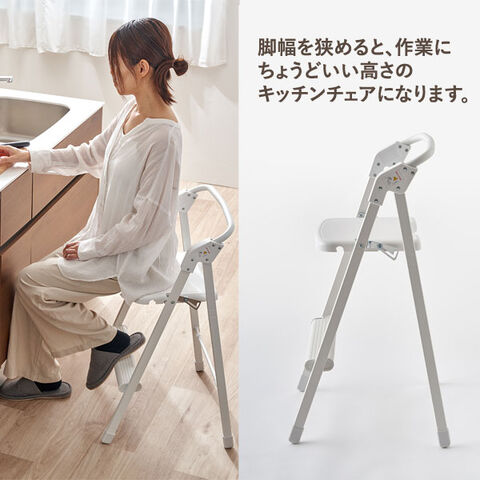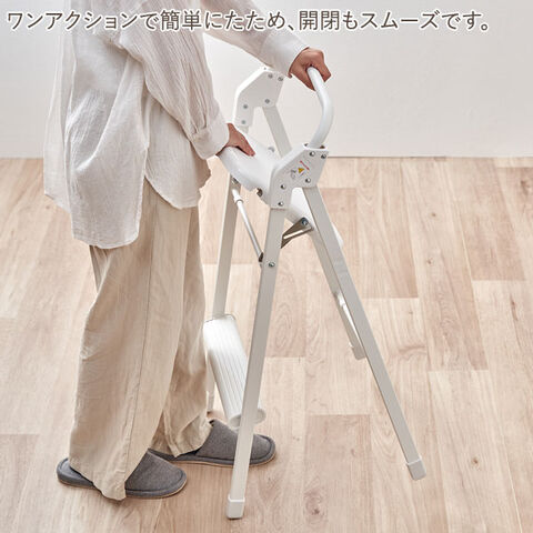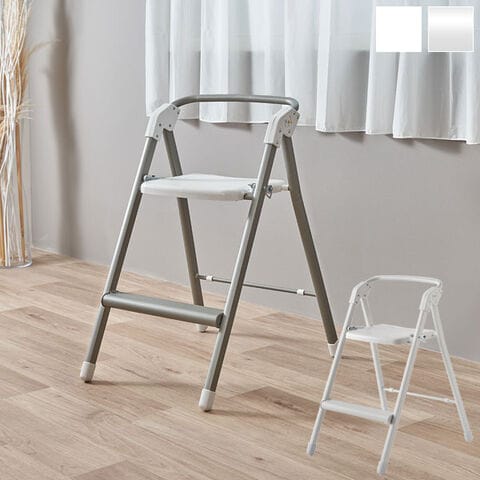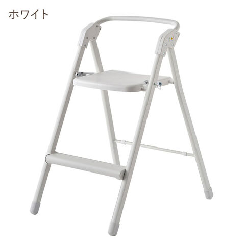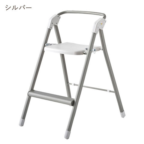 重量わずか2.7kg。とっても軽いアルミ製のサッと使える踏み台チェア。脚が開いた状態では、安定感のある踏み台の幅になり、キッチンの吊り戸棚のものを取るときや、照明の交換、カーテンの付け替えなどに。脚の開き幅を狭めることで、作業にちょうどいい高さの椅子として使えるので、調理中などちょっと腰を掛けたいときに。折りたたむと厚さはわずか約10.5cmになるので、ちょっとした隙間に収納可能。座面の上げ下げだけで脚が自然に開閉するワンアクション設計で、開閉もスムーズです。背もたれは踏み台として使用する際に手すりになるので乗り降りもラクに行えます。カラーはシルバーとホワイトの2色からお選びいただけます。