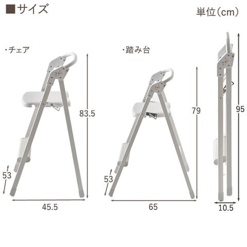 | サイズ(約) | 踏み台/幅53×奥行65×高さ79cm(座面/54.5cm) チェア/幅53×奥行45.5×高さ83.5cm(座面/57cm) 折りたたみ時/幅53×奥行10.5×高さ95cm |