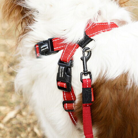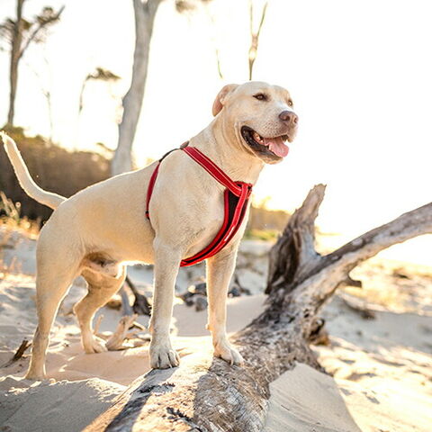 引っ張られる力をチェストプレートで緩和する、軽量かつ丈夫なハーネスです。ストラップに過度な圧力が加わって、毛や肌が擦れたりするのを防ぎます。2本の独立したストラップでサイズ調整が可能で、激しい動きにも対応しています。反射機能付き。