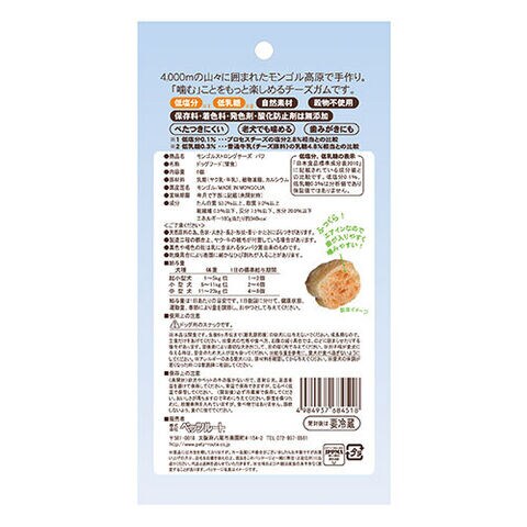 【使用上の注意】ドッグ用のスナックです。※本品は間食です。生後6ヶ月位まで(離乳期前後)の幼犬には与えないでください。成長期なので、主食だけをあげてください。※愛犬の性格や食べ方、お腹の減り具合では、のどに詰まらせたりする場合があります。個体差により適切な大きさにして、目の届く所で与えてください。※お子様が愛犬に与える時は、安全のため大人が立ち会ってください。※給与量を参考に、愛犬が食べ過ぎないようにしてください。※アレルギーのある愛犬には、原材料を確認してから与えてください。※愛犬の体調が悪くなった時には獣医師に相談してください。【保存上の注意】〈未開封〉幼児やペットの手が届かない所で、直射日光、高温多湿を避けて保存してください。常温で保存できますが、なるべく低温で保管してください。〈開封後〉必ず冷蔵庫で保存してください。おいしさが落ちますので早めに与えてください。鮮度を保つために、脱酸素剤を入れていますが、食べ物ではありません。誤飲をしないよう、直ぐに捨ててください。