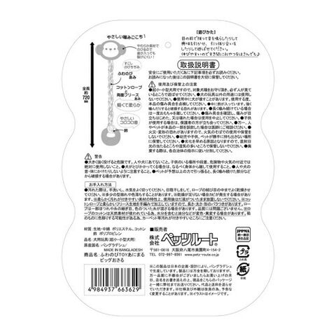 【使用上及び保管上のご注意】●超小・小型犬用ですので、対象犬種をお守り頂き、必ず人が見ているところで遊ばせてください。●犬の玩具以外の用途には使用しないでください。●使用中に犬が壊すことがあります。使用する度、本品の傷み具合を点検してください。●中に鈴が入っています。強く噛んだりすると破損する恐れがあります。●長く噛み続けている場合は一度おもちゃを離してください。●傷み具合を確認し、傷みが目立ちはじめた、又は壊れた場合は使用を中止してください。●子供が使用する場合は、保護者の方が立ち会ってください。●万一、人やペットが本品の一部を誤飲した場合は医師にご相談ください。●火災・変形の恐れがありますので、火気のそばでの使用や保管をしないでください。●幼児や子供、ペットが勝手に持ち出さない場所に保管してください。●劣化を早める原因となりますので、直射日光の当たるところや湿気の多いところで保管しないでください。●廃棄する際は、各自治体の指示に従い分別してください。【警告】●大きく強く投げると危険です。人や犬にあてないこと。子供のいる場所や段差、危険物や火気の付近では絶対に使用しないこと。●犬がとびかかってくる場合は