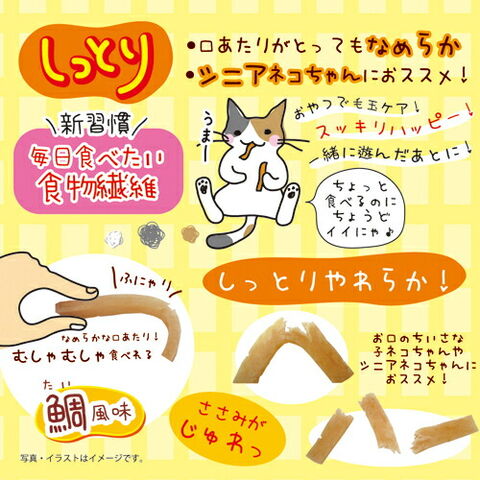 鯛風味付きで食物繊維約10%。ささみがじゅわっ?口あたりがとってもなめらかで、シニアネコちゃんにおススメの毛玉ケアスナックです。