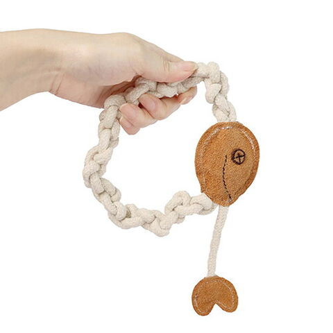 夢中になるにおいと噛み心地!リングになったロープと丈夫な革のおもちゃです。しっかりぎゅっと編みこんだみつあみ。ひっぱり・持ってこい遊びにも。
