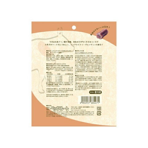 【使用上の注意】※本品は間食です。生後3ヶ月位まで(離乳期前後)の幼犬には与えないでください。成長期なので、主食だけをあげてください。※愛犬の性格や食べ方、お腹の減り具合では、のどに詰まらせたりする場合があります。個体差により適切な大きさにして、目の届く所で与えてください。※お子様が愛犬に与える時は、安全のため大人が立ち会ってください。※給与量を参考に、愛犬が食べ過ぎないようにしてください。※アレルギーのある愛犬には、原材料を確認してから与えてください。※愛犬の体調が悪くなった時には獣医師に相談してください。【保存上の注意】〈未開封〉幼児やペットの手が届かない所で、直射日光、高温多湿を避けて保存してください。常温で保存できますが、なるべく低温で保管してください。〈開封後〉チャックを閉じ、必ず冷蔵庫で保存してください。おいしさが落ちますので早めに与えてください。鮮度を保つために、脱酸素材を入れていますが、食べ物ではありません。誤飲しないよう、直ぐに捨ててください。