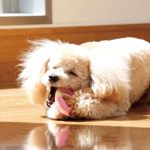 楽しくって歯に良いおもちゃ「ハーツデンタルトイシリーズ」は、犬の気持ちと身体を科学して、遊びとデンタルケアをひとつにしました。パピー、シニアも使えるソフトタイプです。ポツポツ部分はTPR採用で、硬さは従来の約半分、噛んで適度な弾力を楽しめます。また、白い枠部分は従来同様ナイロン素材を使用し、耐久性を維持しています。